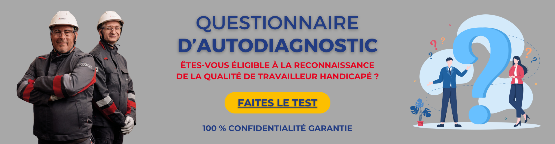 Notre questionnaire d’autodiagnostic sur la Reconnaissance de la Qualité de Travailleur Handicapé est 100% anonyme et confidentiel. Faites le test en toute confiance.